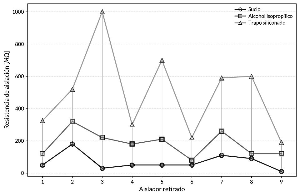 De la experiencia realizada se pudo comprobar que después de cada paso del procedimiento planteado la resistencia de aislación de cada aislador iba aumentando, llegando en algunos casos a valores 3 o 4 veces más de los obtenidos en las condiciones iniciales. Es de notar que aisladores que solo tenían suciedad adherida, presencia de polvo y partículas lograron resultados significativos en cuanto a mejorar sus valores de resistencia de aislación. Mientras que aisladores que presentaban daños a nivel de superficie en la porcelana (pérdidas de coloración, descargas puntuales o signos de calentamiento) no lograron mejorar sustancialmente (en términos cuantitativos) el valor inicial obtenido de resistencia de aislación. A los efectos de una mejor visualización (Figura 3) de las mejoras obtenidas después de las acciones de mejoras realizadas en los aisladores retirados, solo se graficaron 9 de los 11 aisladores retirados. Los 2 aisladores restantes que no aparecen en la gráfica tuvieron valores muy por encima del resto después de la aplicación del procedimiento (4800-16000 MΩ).