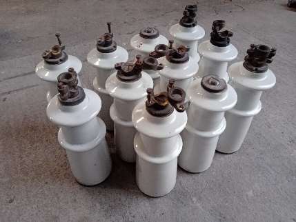 (a) Aislador de porcelana típico que se puede encontrar en una subestación. (b) 11 aisladores de servicio retirados de servicio utilizados para ensayos.