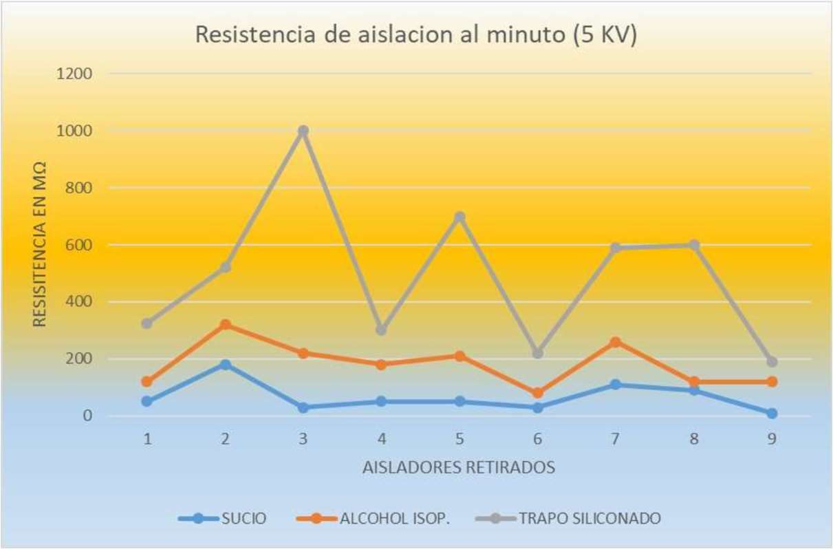Medición de resistencia de aislación a 5 kV de los aisladores retirados (9 de los 11) de servicio en 3 condiciones. En curva azul: resistencia de aislación de aisladores cómo se recibieron (con polvo, o contaminación); en curva naranja: resistencia de aislación luego de limpiar con trapo seco y limpiar con alcohol isopropílico; en curva gris: resistencia de aislación luego limpieza con franela siliconada.